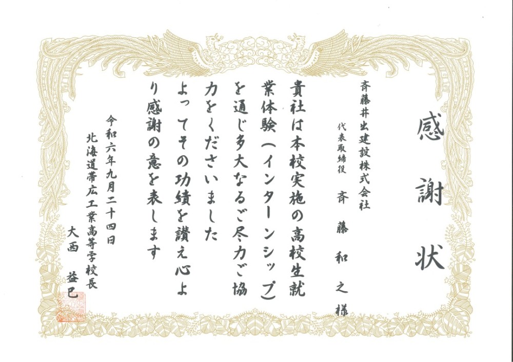 帯広工業高等学校より、インターンシップ受け入れのお礼と感謝状を頂きました