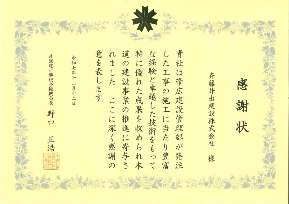 先日、帯広建設管理部より工事優良企業として感謝状を頂きました